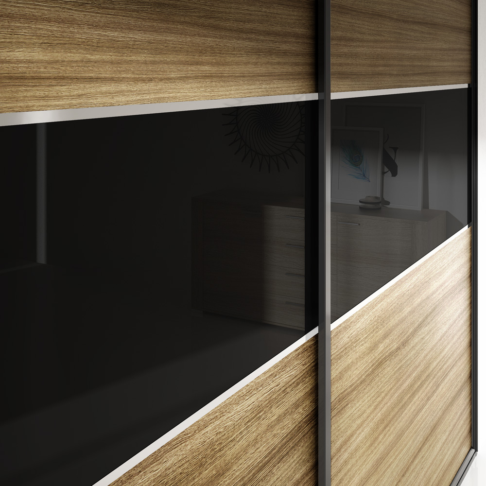 | Acabado | Franja Lacobell Negro, Madera Roble Tobacco Veta Horizontal, Pletina H de 10mm. Cromo Brillo |