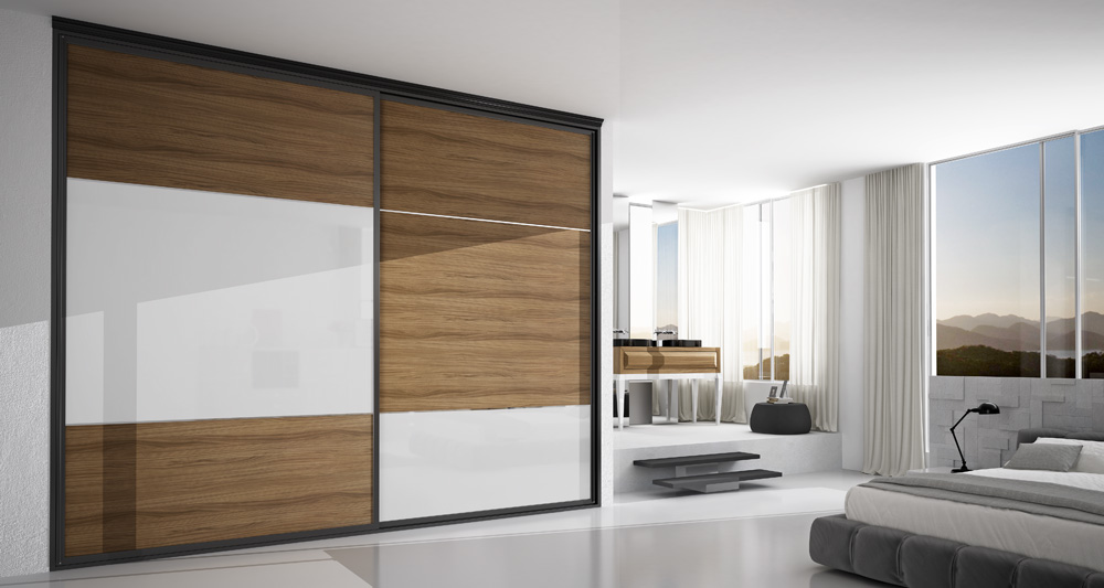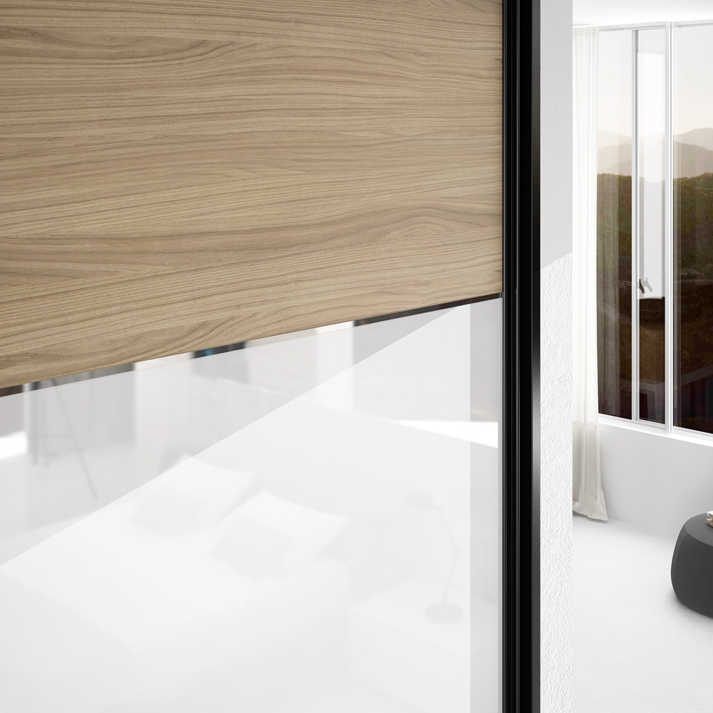 Madera Blanca Alto Brillo, Madera Nogal Canaletto Veta Horizontal, Pletina H de 10mm. Cromo Brillo